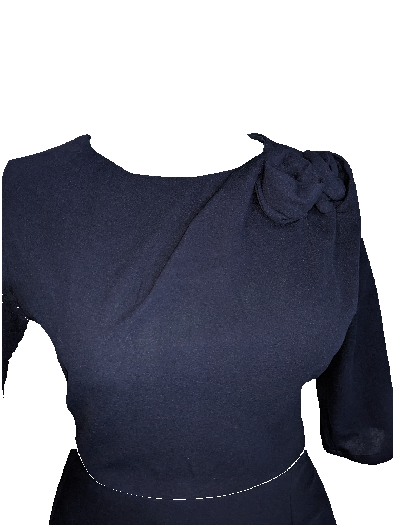 Elegance and creativity unite in the Navy Rose Petal Pencil Dress, a piece designed to celebrate both sophistication and individuality. With a sleek, simple neckline and a subtle side front slit, this dress exudes understated grace while offering effortless movement.
