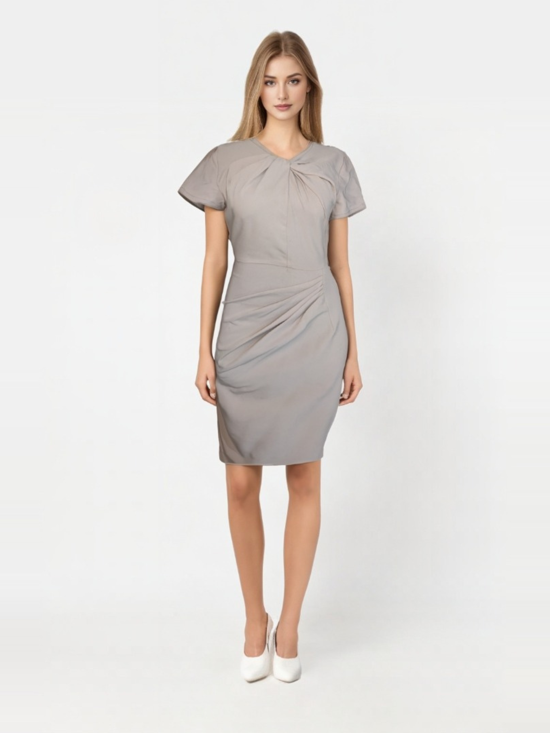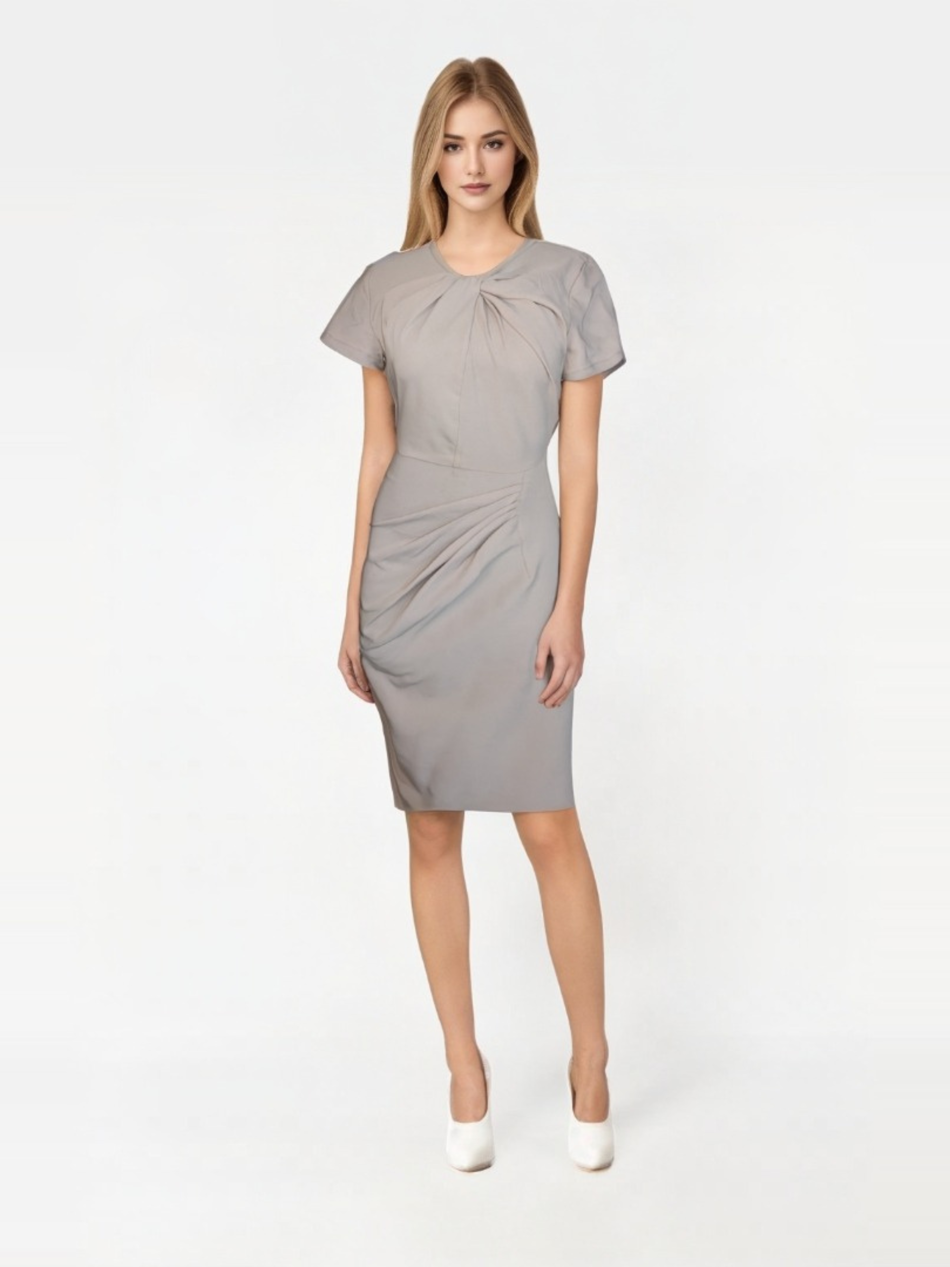 The pleated twist-front bodice adds a touch of intrigue, seamlessly balancing structure and softness. Its short sleeves provide a playful, effortless vibe, while the pencil silhouette offers a snug fit that flatters your form beautifully. Falling just below the knee, it’s the perfect length to exude grace at every occasion.
